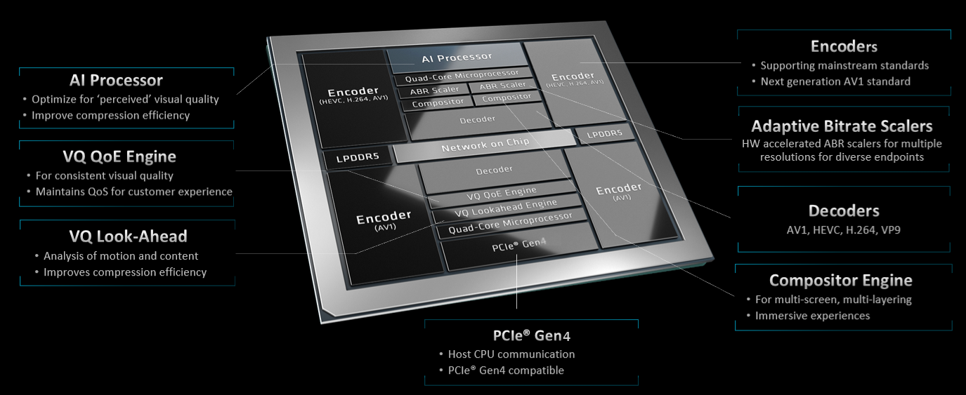 Simultaneous transcoding with a maximum aggregated bandwidth of 4x 4Kp60 per card for AVC or HEVC and 8x 4Kp60 for AV1